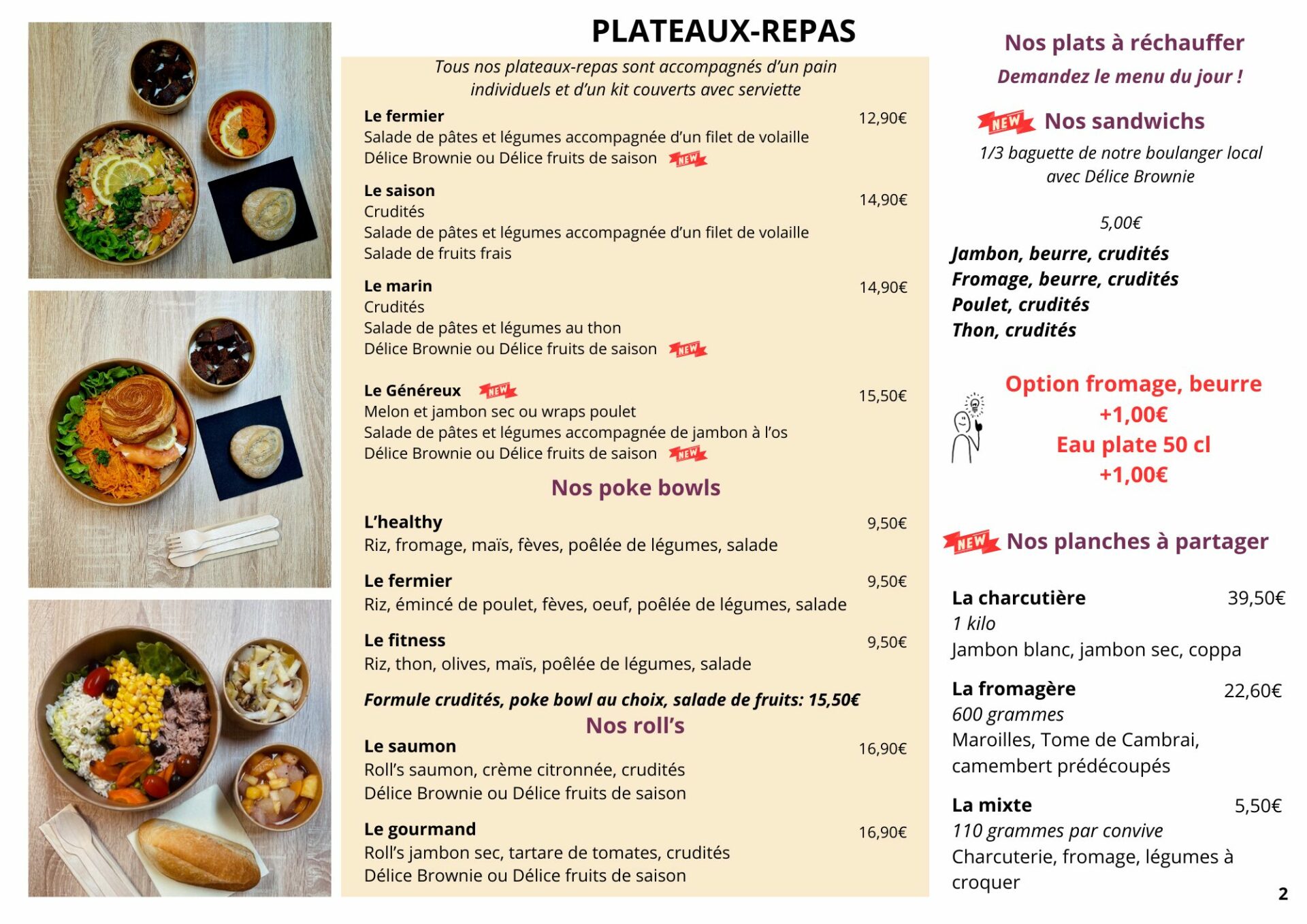 Nous proposons premièrement des plateaux-repas froids, deuxièmement des poke bowls volaille ou poisson ou troisièmement des plateaux-repas haut de gamme à base de poisson ou de viande.