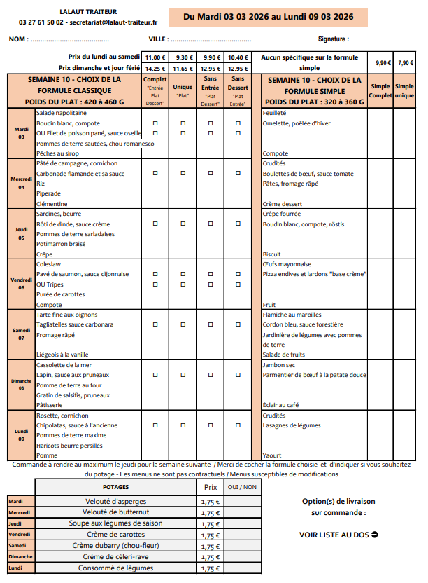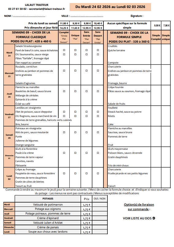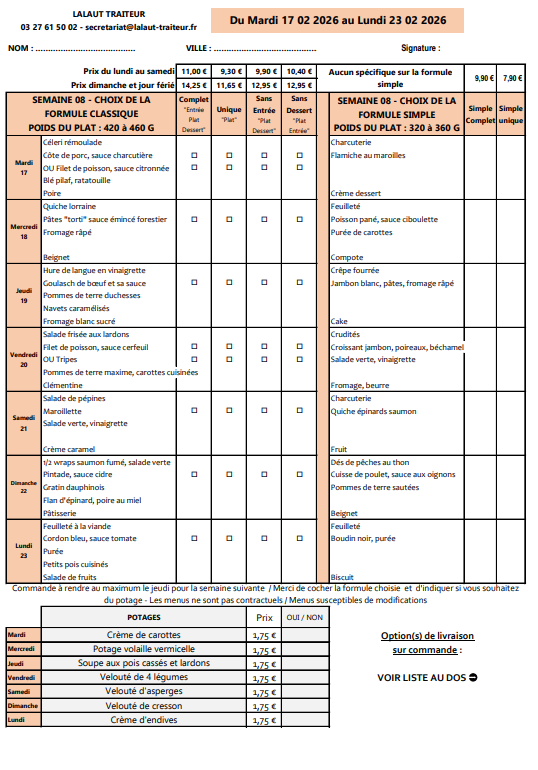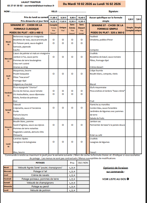 Lalaut Traiteur vous propose son service de portage de repas à domicile à partir de 7,90€.